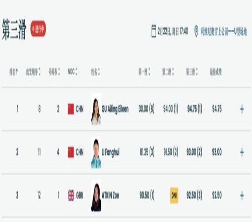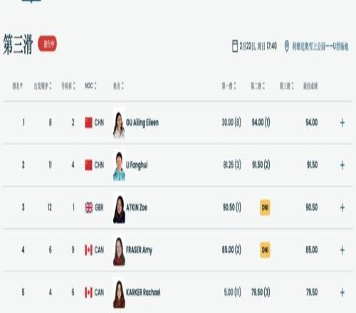 李方慧在隨后也給中國觀眾帶來驚喜!她不斷提升自己的完成度,拿到91.50分來到第二!英國選手佐伊·阿特金此后一跳出現失誤,在第二跳結束后,以第一跳90.50分的最高得分排在第三。