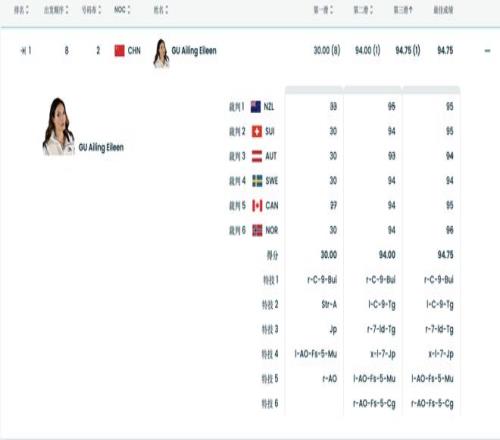 第二跳,衛(wèi)冕冠軍谷愛凌展現出極其強大的心理素質,開場正腳和反腳900度的抓板動作完成度極高,高度也來到了3.8米!連續(xù)兩次540度Alley-oop的結尾動作相當穩(wěn)健,得到全場最高94.00分的同時躍升至全場第一!