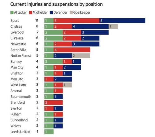 熱刺當(dāng)前11人受傷為英超最多,阿森納僅2人傷停