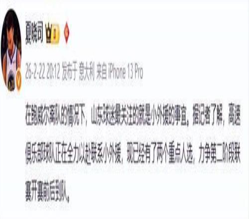 至于小外援?根據(jù)山東媒體人夏曉司的報(bào)道,山東男籃俱樂(lè)部已鎖定兩名重點(diǎn)目標(biāo),正全力推進(jìn)簽約,目標(biāo)明確:第二階段開賽前,必須到位。