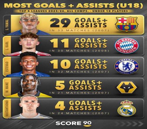 本賽季五大聯(lián)賽U18球員直接參與進(jìn)球TOP5:
