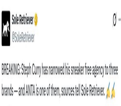 北京時間2月23日,據(jù)媒體Sole Retriever報道,斯蒂芬-庫里已將球鞋品牌候選縮小到三家,安踏就在其中。