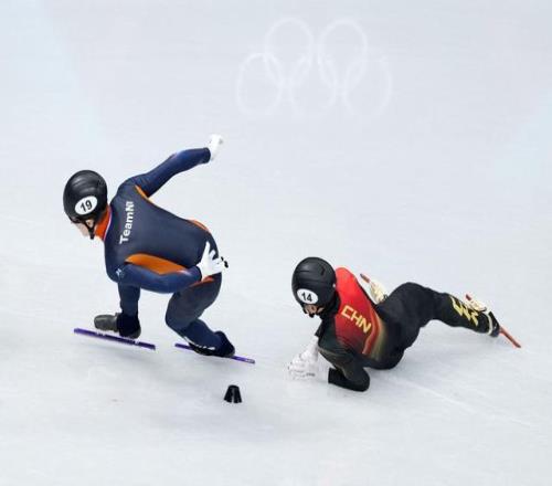 2月18日,劉少昂(右)在短道速滑男子500米半決賽中摔倒。新華社記者 薛宇舸 攝