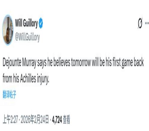 北京時間2月24日,據(jù)鵜鶘隊記吉洛里報道,德章泰-穆雷表示,他預計將在明日迎來本賽季首秀。鵜鶘明天將主場迎戰(zhàn)勇士。