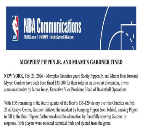 北京時(shí)間2月24日,NBA官方開出罰單,宣布此前在場上互毆的小皮蓬與加德納均罰款3.5萬美元。