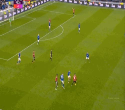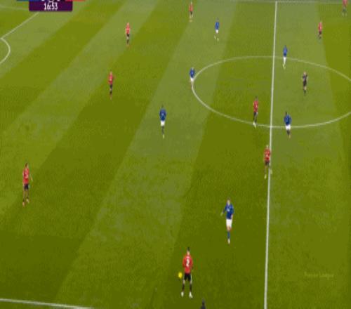至于曼聯(lián),由于各種各樣的問題和原因,表現(xiàn)也不是多好,但在部分回合,還是存在一些微小的優(yōu)勢,就像第36分鐘,達(dá)洛特從肋部上去找到姆貝烏莫的時候,后者還是能甩開埃弗頓的雙中衛(wèi),為自己拉出處理球的空間:
