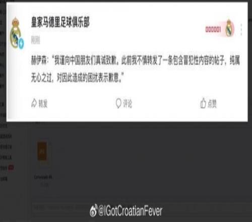 博主“IGotCroatianFever”微博曬圖,收到了皇馬對(duì)于赫伊森辱華事件的回復(fù),稱球員已通過中國(guó)社媒進(jìn)行了道歉?;蜀R回復(fù)郵件內(nèi)容:尊敬的先生/女士:關(guān)于您的郵件,我們?cè)诖烁嬷騿T已按照隨附新聞稿中的表述,在中國(guó)社交媒體上致歉:“我為無意中分享了冒犯華人社區(qū)的帖子而道歉。這是一次無心之失,并無任何惡意。”