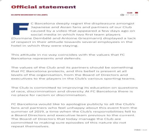 2019年巴薩亞洲行期間,格列茲曼和登貝萊有種族歧視行為,巴薩在官網(wǎng)發(fā)布道歉聲明:“一段我俱樂部?jī)擅騿T用輕佻和缺乏尊重的語言稱呼他們所住的酒店員工的視頻流傳出來,引起了日本球迷、亞洲球迷以及我們的合作伙伴的不滿。巴塞羅那俱樂部對(duì)此不滿表示理解并深表遺憾,向每一個(gè)因?yàn)?019年亞洲行感到不快的球迷和成員們道歉?!备窳衅澛偷秦惾R本人也在外國(guó)社媒上公開道歉。
