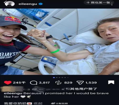 2月23日凌晨,谷愛凌在社媒曬出和外婆的照片,配文:“我承諾過要像你一樣的勇敢,我愛你奶奶。”