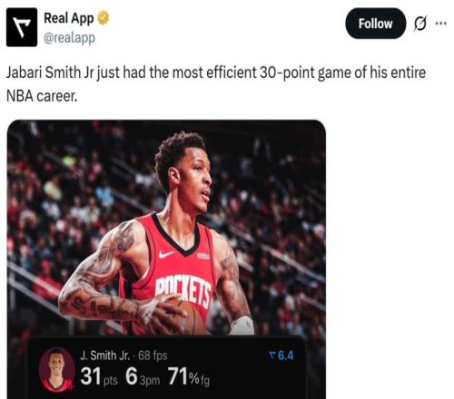 全場(chǎng)出戰(zhàn)32分鐘,17中12,三分11中6轟下31分9板3斷3帽全能數(shù)據(jù),以86.7%的真實(shí)命中率砍下31分創(chuàng)造其生涯最高效的一場(chǎng)30+。