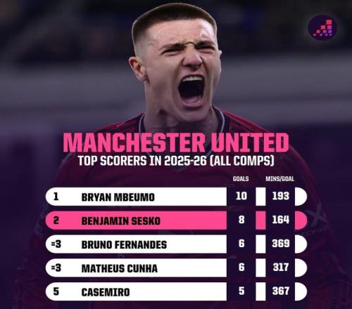 在與埃弗頓的英超第27輪比賽中,謝什科替補登場打入一球,至此,曼聯(lián)前鋒謝什科本賽季各項賽事已打入8球,平均每164分鐘打入一球。