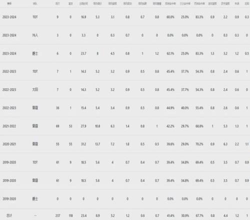 常規(guī)賽出戰(zhàn)237場(chǎng)首發(fā)118次,場(chǎng)均上陣23.7分鐘拿到8.9分5.2板1.2助進(jìn)賬,三項(xiàng)命中率41.4%、30.9%和67.7%;季后賽出戰(zhàn)七場(chǎng),場(chǎng)均上陣18分鐘收獲6.6分6.7板,三項(xiàng)命中率41.9%、50%和90%。