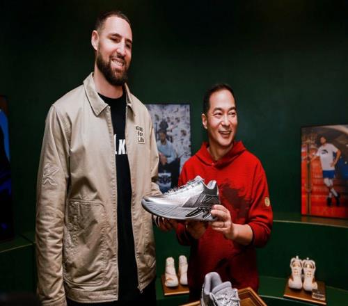 在北美旗艦店開(kāi)業(yè)當(dāng)日,代言人克萊·湯普森與KT11特別版球鞋合影 圖片來(lái)源:安踏官方