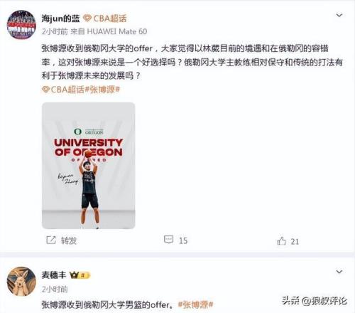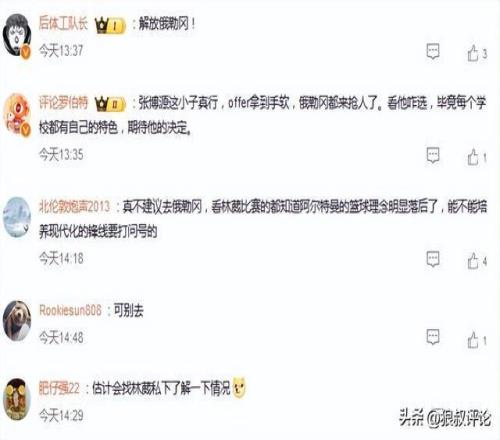 媒體人“海jun的藍(lán)”發(fā)文點(diǎn)評(píng):張博源收到俄勒岡大學(xué)的offer,大家覺得以林葳目前的境遇和在俄勒岡的容錯(cuò)率,這對(duì)張博源來說是一個(gè)好選擇嗎?俄勒岡大學(xué)主教練相對(duì)保守和傳統(tǒng)的打法有利于張博源未來的發(fā)展嗎?
