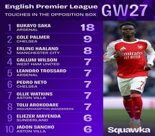 英超第27輪在對(duì)手禁區(qū)觸球次數(shù)排名