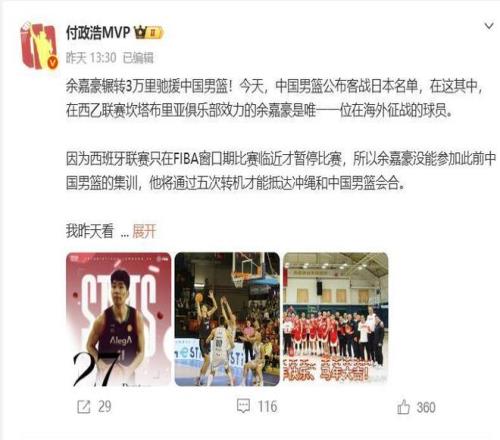 根據(jù)媒體人付政浩的消息,西班牙聯(lián)賽只有在FIBA窗口期比賽臨近的時(shí)候才會(huì)暫停比賽,所以留給余嘉豪的時(shí)間非常短,當(dāng)?shù)貢r(shí)間昨天晚上他還在打比賽,今天連續(xù)周轉(zhuǎn)5次航班累計(jì)飛行超過(guò)1.4萬(wàn)公里才能抵達(dá)沖繩,這種精神值得所有男籃球員們學(xué)習(xí)。昨天客場(chǎng)的比賽是在西班牙位于非洲的飛地梅利利亞打的,比賽結(jié)束后余嘉豪先從梅利利亞飛往馬加拉,然后再飛回巴塞羅那,從巴塞羅那飛往北京,再?gòu)谋本╋w往東京,最后一程是東京飛往沖繩。