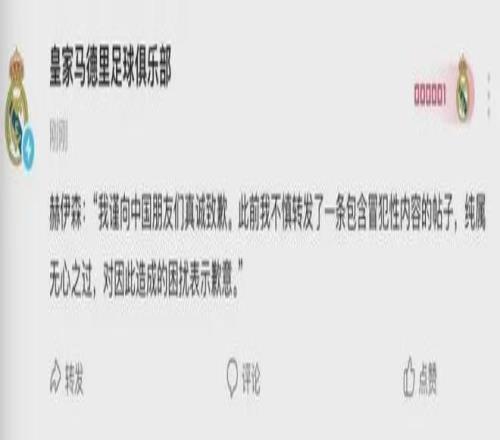 直到壓力無法回避,皇馬終于“行動(dòng)”了。2月22日晚,皇馬官方微博發(fā)布了一則赫伊森的“道歉聲明”,全文中文,核心意涵只有四個(gè)字:“無心之過”。