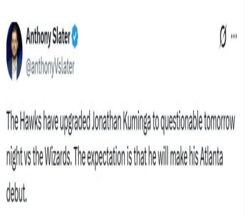 北京時間2月24日,據(jù)名記Slater報道,老鷹已將喬納森-庫明加明日對陣奇才的狀態(tài)升級為出戰(zhàn)成疑,預(yù)計他將在明日完成老鷹生涯首秀。