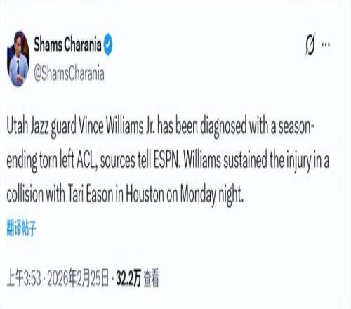 北京時(shí)間2月25日,據(jù)名記Shams報(bào)道,在接受進(jìn)一步檢查后,爵士球員小文斯-威廉姆斯確診為左膝前交叉韌帶(ACL)撕裂。這一傷勢(shì)不僅讓威廉姆斯直接報(bào)銷(xiāo)2025?26賽季,按照這類(lèi)傷病的常規(guī)恢復(fù)周期,他2026?27賽季的大部分時(shí)間也很可能無(wú)法出戰(zhàn)。
