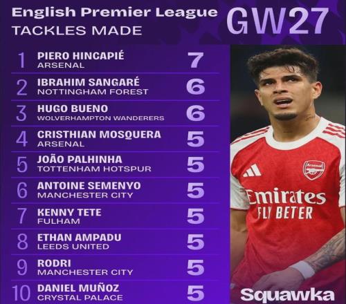 Squawka統(tǒng)計(jì),因卡皮耶在對熱刺的比賽中完成了7次鏟斷,是本賽季阿森納球員在單場英超比賽中鏟斷次數(shù)并列最多的(廷貝爾對曼城)。