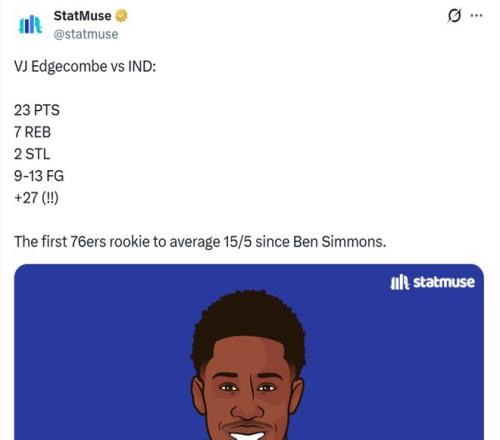 雙核轟59+15+13全能數(shù)據(jù),恩比德持續(xù)暴走夢回巔峰!超級(jí)探花埃奇庫姆更該夸,高效轟23+7在場凈勝27分成76人近10年來首人+隊(duì)史第一助飛費(fèi)城成為大黑馬攪局東部。