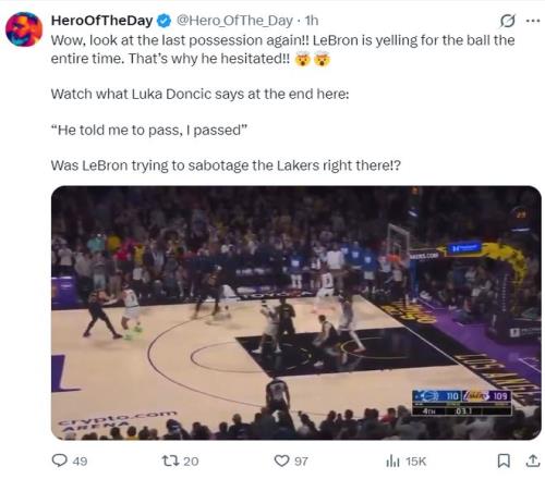 東契奇有一個(gè)超級(jí)空位沒有出手,他卻將球傳給了底角有人盯防的詹姆斯,詹姆斯接到這個(gè)球時(shí)只剩下2.5秒,詹姆斯轉(zhuǎn)身三分出手不中。