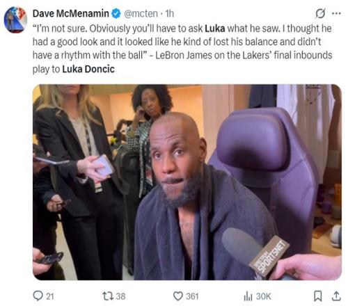 詹姆斯賽后也表示,東契奇應(yīng)該投那是一個(gè)空位,傳給我時(shí)有點(diǎn)失去平衡了。