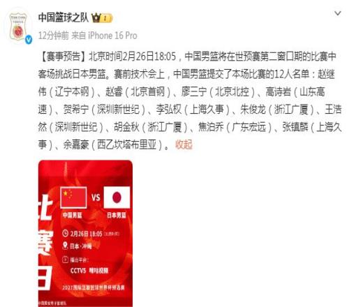 中國男籃官宣戰(zhàn)日本12人名單:趙睿趙繼偉領(lǐng)銜胡明軒趙嘉義落選