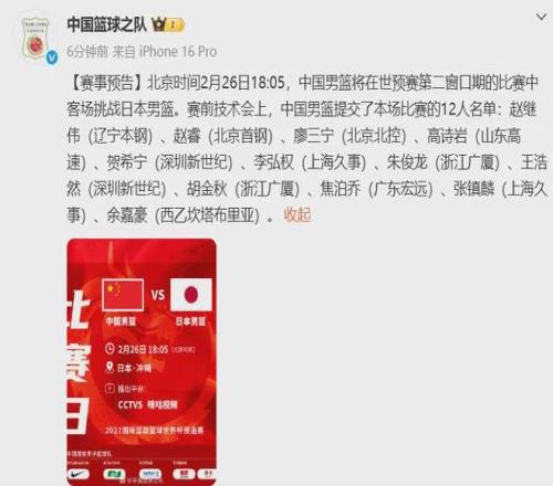 中國男籃公布對(duì)陣日本男籃的12人大名單,如下: