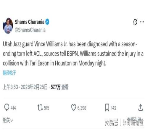 賽后-威廉姆斯接受了核磁共振檢查,結果令人痛心——他左膝蓋十字韌帶撕裂,這不僅意味著他本賽季報銷,更可能預示著他職業(yè)生涯的終結。文思是2022年選秀大會上的第47順位新秀,目前正處于新秀合同的最后一年,既未獲得提前續(xù)約,球隊也未流露出續(xù)約意向。他原本還想著在賽季末段奮力一搏,爭取留隊機會,如今卻一切成空。