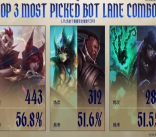 電競體育2月26報道 今天官方直播流給出LPL歷史下路組合登場數,霞洛是登場最多的組合,共有443場;