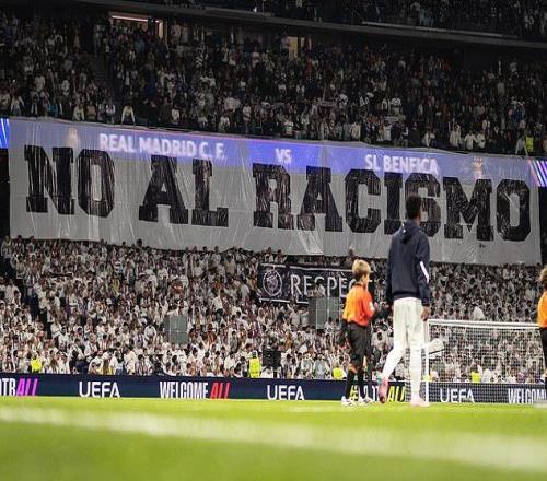 周三,在圣地亞哥?伯納烏球場(chǎng)的賽前展示環(huán)節(jié)中,現(xiàn)場(chǎng)還懸掛了巨大的“反對(duì)種族主義”橫幅,看臺(tái)上一名球迷卻被拍到做出相關(guān)手勢(shì)。
