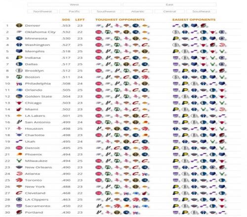 其中掘金與雷霆難度高居前二值得關(guān)注,尤其是考慮到兩支球隊(duì)還將3次正面相遇,這三場比賽的結(jié)果不僅將影響兩隊(duì)潛在對決的心理優(yōu)勢,也將極大影響西部最終的排名局勢。