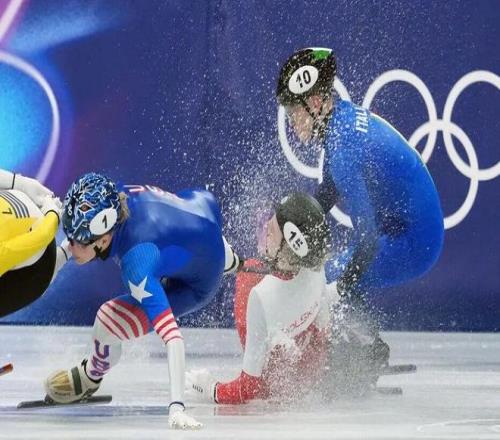 那是周五晚上的短道速滑女子1500米四分之一決賽,場(chǎng)上的氣氛緊張得讓人屏息。短道速滑這個(gè)項(xiàng)目,大家知道,那就是“冰上F1”,選手們?cè)跇O窄的半徑里以極高的速度貼地飛行。