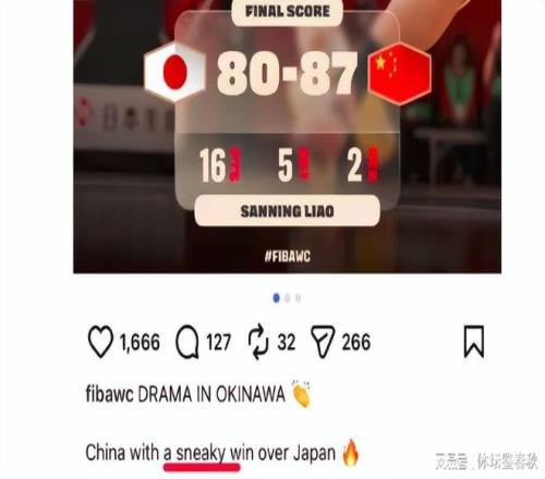 而就在今天凌晨,國際籃聯(lián)官網(wǎng)在戰(zhàn)報(bào)中用中國隊(duì)“從日本偷走一場勝利”來形容這場比賽的結(jié)果。這一表述引發(fā)了球迷的極大憤慨。中國隊(duì)是在客場完成翻盤,用“偷”來形容顯得格外刺耳。國外論壇同樣有聲音質(zhì)疑這一措辭是否失當(dāng)。幾個(gè)小時(shí)后,國際籃聯(lián)官網(wǎng)將這段文字改為“下半場完成逆轉(zhuǎn)并帶走勝利”。