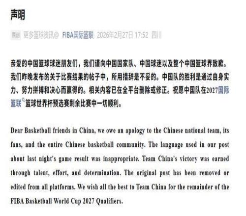 2月27日,F(xiàn)IBA國(guó)際籃聯(lián)發(fā)布致歉聲明: