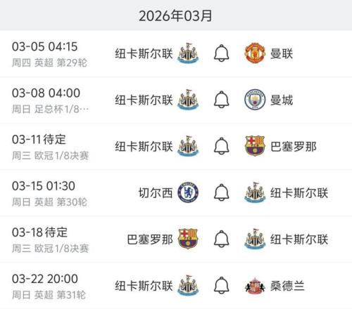 紐卡將在兩周時(shí)間里連續(xù)迎戰(zhàn)曼市雙雄、切爾西,并進(jìn)行與巴薩的兩回合歐冠較量。3月最后一場(chǎng)比賽里,他們將在主場(chǎng)迎來(lái)東北德比對(duì)手桑德蘭。