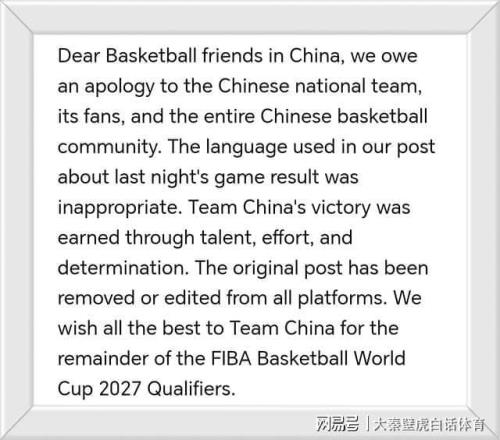 “親愛的中國籃球球迷朋友們,我們謹(jǐn)向中國國家隊(duì)、中國球迷以及整個中國籃球界致歉。