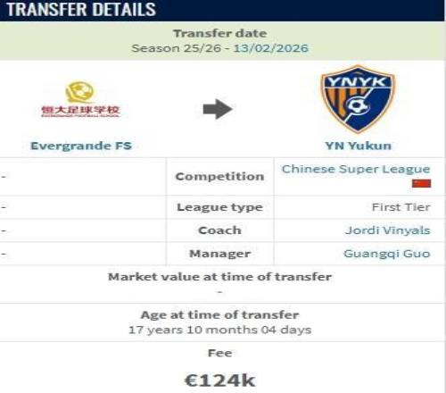 德轉顯示,云南玉昆約100萬人民幣從恒大足校簽下布尼亞明。