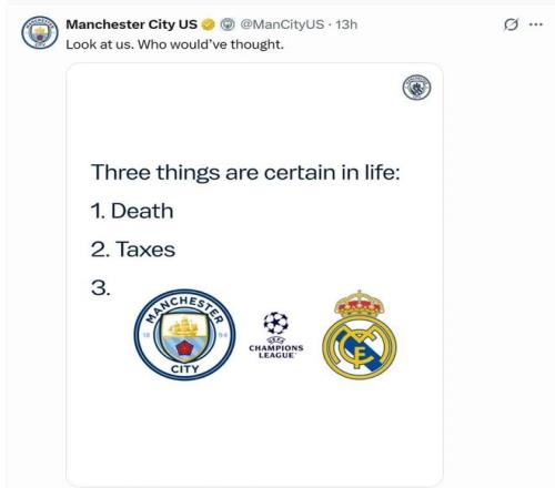 北京時(shí)間2月28日凌晨,官方社交媒體發(fā)文曬出了一張圖片,并配以“看看我們,誰(shuí)能想到呢”的文字。而圖片中則寫道:“人生中有三件事是注定的,1、死亡;2、稅收;3、曼城vs皇馬”。