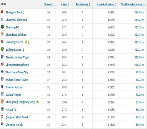 在中超球隊(duì)里,兩支青島球隊(duì)的身價(jià)排名墊底,青島西海岸為641萬歐元,青島海牛則只有549萬歐元,是唯一一支身價(jià)沒有超過600萬的中超球隊(duì)。