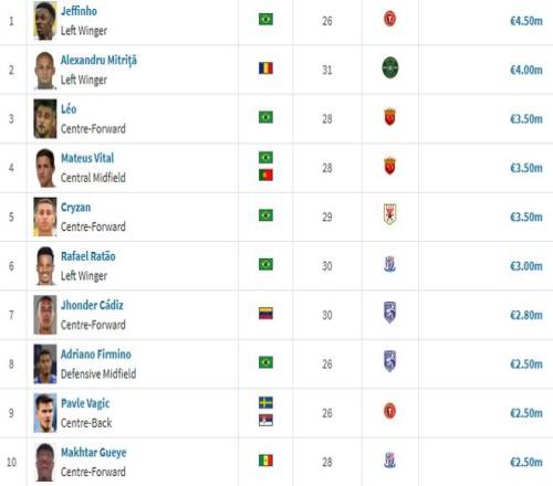 升班馬遼寧鐵人則以1301萬歐元排名第5位,熱菲尼奧以450萬歐元的身價(jià)成為中超身價(jià)最高的球員,力壓米特里策(400萬)以及身價(jià)達(dá)到350萬的維塔爾、克雷桑、萊昂納多。