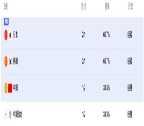 目前,B組的積分為:日本隊(duì)5分第一名,韓國(guó)隊(duì)5分第二名,中國(guó)隊(duì)4分第三名,中國(guó)臺(tái)北隊(duì)墊底。