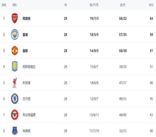在積分榜上,阿森納以64分領(lǐng)跑,戰(zhàn)績是19勝7平3負(fù)。曼城拿到59分,排名第2。阿森納比曼城多了5分,但比曼城多踢1場。曼聯(lián)贏球之后升到了第3名,總積分達(dá)到51分。阿斯頓維拉也是51分,但凈勝球遠(yuǎn)不如曼聯(lián),排名掉到第4。利物浦以48分排名第5。切爾西輸球后,積分依然是45分,排名第6。布倫特福德43分,排名第7。