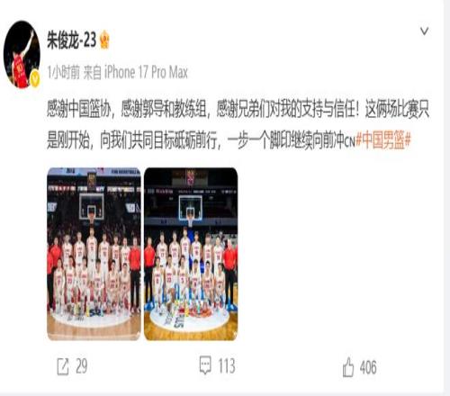 賽后,朱俊龍還在社媒發(fā)文,表示:感謝中國(guó)籃協(xié),感謝郭導(dǎo)和教練組,感謝兄弟們對(duì)我的支持與信任!這兩場(chǎng)比賽只是剛開始,向我們共同目標(biāo)砥礪前行,一步一個(gè)腳印繼續(xù)向前沖。