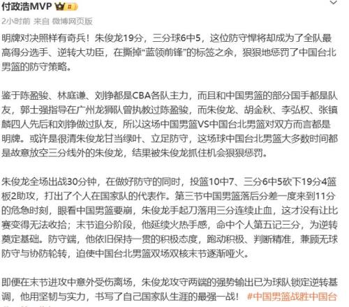 此役,擔(dān)任中國(guó)隊(duì)首發(fā)小前鋒的朱俊龍表現(xiàn)堪稱卓越,上場(chǎng)奮戰(zhàn)30分鐘,投籃10中7球,三分球6投5中,砍下全隊(duì)最高的19分、4個(gè)籃板以及2次助攻,在中國(guó)隊(duì)落后階段多次命中底角三分幫助球隊(duì)渡過難關(guān),如同定海神針,幫助球隊(duì)最終逆轉(zhuǎn)臺(tái)北,賽后朱俊龍也獲得了球迷的高度好評(píng),不少球迷和媒體人都將他評(píng)為中國(guó)隊(duì)本場(chǎng)比賽的MVP。