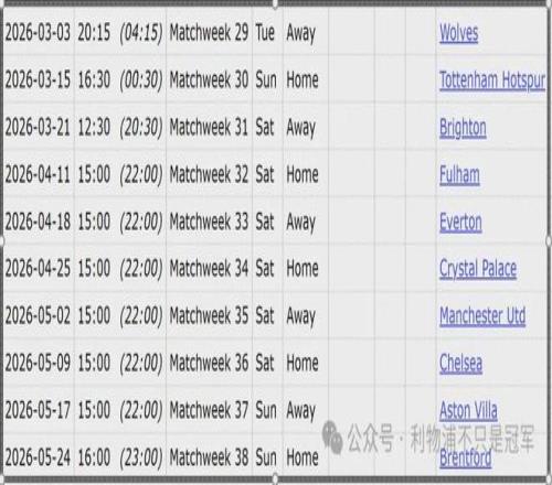 利物浦最后10輪當中,未來6場的難度相對小一點——客場vs狼隊、主場vs熱刺、客場vs布萊頓、主場vs富勒姆、客場vs埃弗頓不好打、主場vs水晶宮;隨后三場難度較大——客場vs曼聯(lián)、主場vs切爾西、客場vs維拉;聯(lián)賽收官戰(zhàn)是主場vs目前排名第7的布倫特福德。