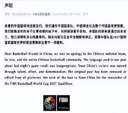 迫于洶涌輿情,國(guó)際籃聯(lián)于當(dāng)晚悄悄將原文中“sneaky”替換為中性詞“narrow”,但未配發(fā)任何說(shuō)明。這種回避式處理非但未能平息眾怒,反而加劇公眾對(duì)其公信力的質(zhì)疑。2月27日清晨,國(guó)際籃聯(lián)火速發(fā)布中英文雙語(yǔ)致歉聲明。