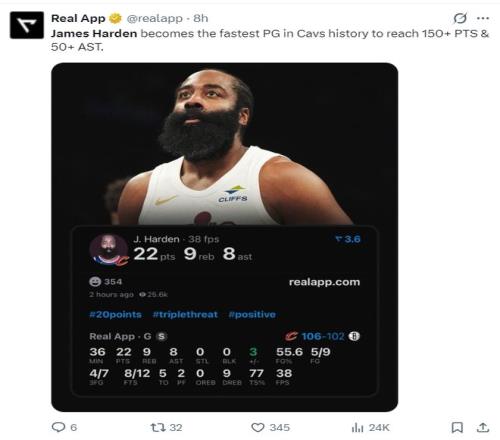 1.哈登成為騎士最快達成150分+50助攻的球員;