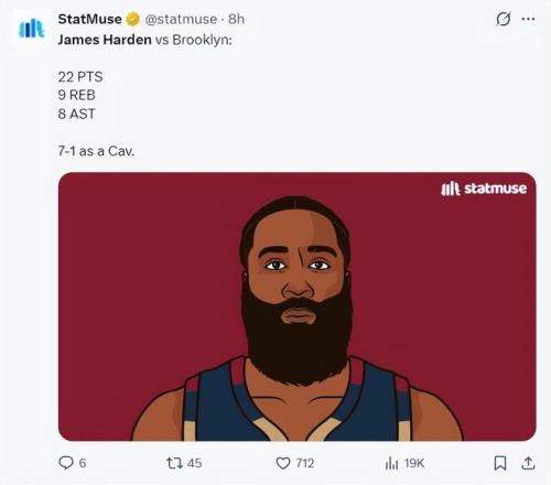 哈登加盟騎士后場均33分鐘,19.3分5.1籃板8助攻,命中率50%,三分命中率50%,罰球命中率81%,在他登場的比賽中騎士7勝1負,哈登一下就成為了新的克村領頭羊。